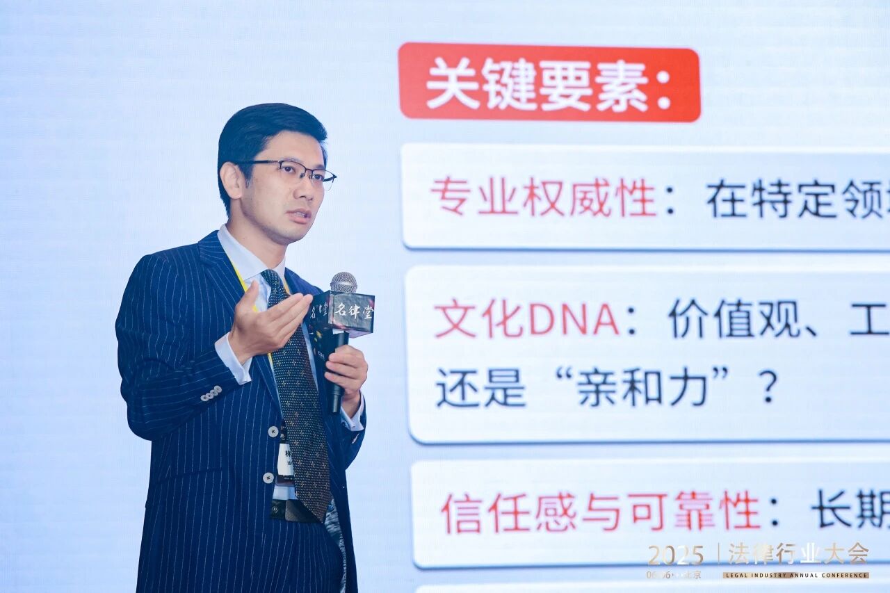最后一位登台演讲的嘉宾是道可特律师事务所高级合伙人林蔚律师,林律师在大会以“看不见的竞争力:律所品牌特质和高格流量”为主题进行分享,他指出,当下法律服务市场面临需求萎缩、竞争加剧、技术冲击困境,律所品牌特质与高格流量成为脱颖而出的关键。林蔚律师强调,品牌特质是律所内在独特稳定的核心身份与价值观集合,超越品牌标识与口号,其关键要素包括专业权威性、文化DNA、信任感与可靠性、独特价值及视觉与感官体验。品牌特质难以模仿,能建立情感连接,是律所提升议价能力与处理危机缓冲的核心。对于高格流量,他解释为符合律所定位、有高价值潜力且认可品牌特质的业务机会来源,律所应追求精准触达与深度影响,注重专业内容输出吸引优质客户,在权威评级机构获佳绩,靠良好声誉与客户转介形成业务增量。