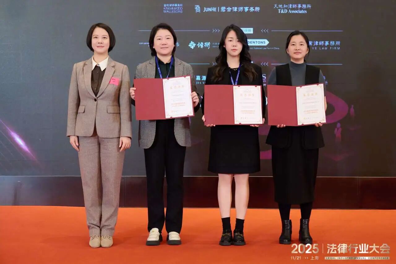 博枫新能源科技(上海)有限公司 大中华区总法律顾问苏泳云(左一)分别为2025名律堂《中国法律先锋榜:领先知产人商标诉讼、新锐合伙人十五强、十五佳杰出女律师》的获奖律师颁发奖杯;大成律师事务所合伙人程强、浩天律师事务所合伙人李明乐(由代表代为领奖)、君合律师事务所合伙人刘宁依次登台领奖(顺序为从左至右)。