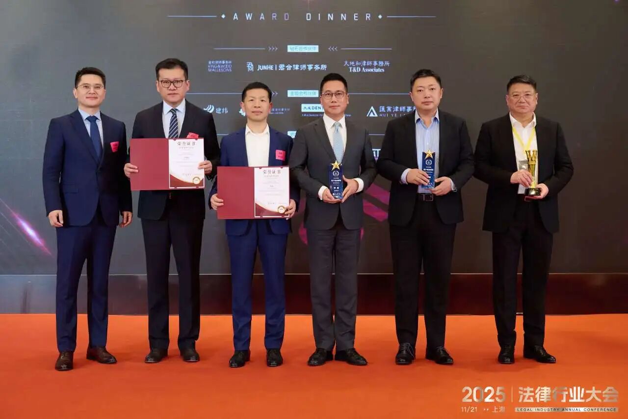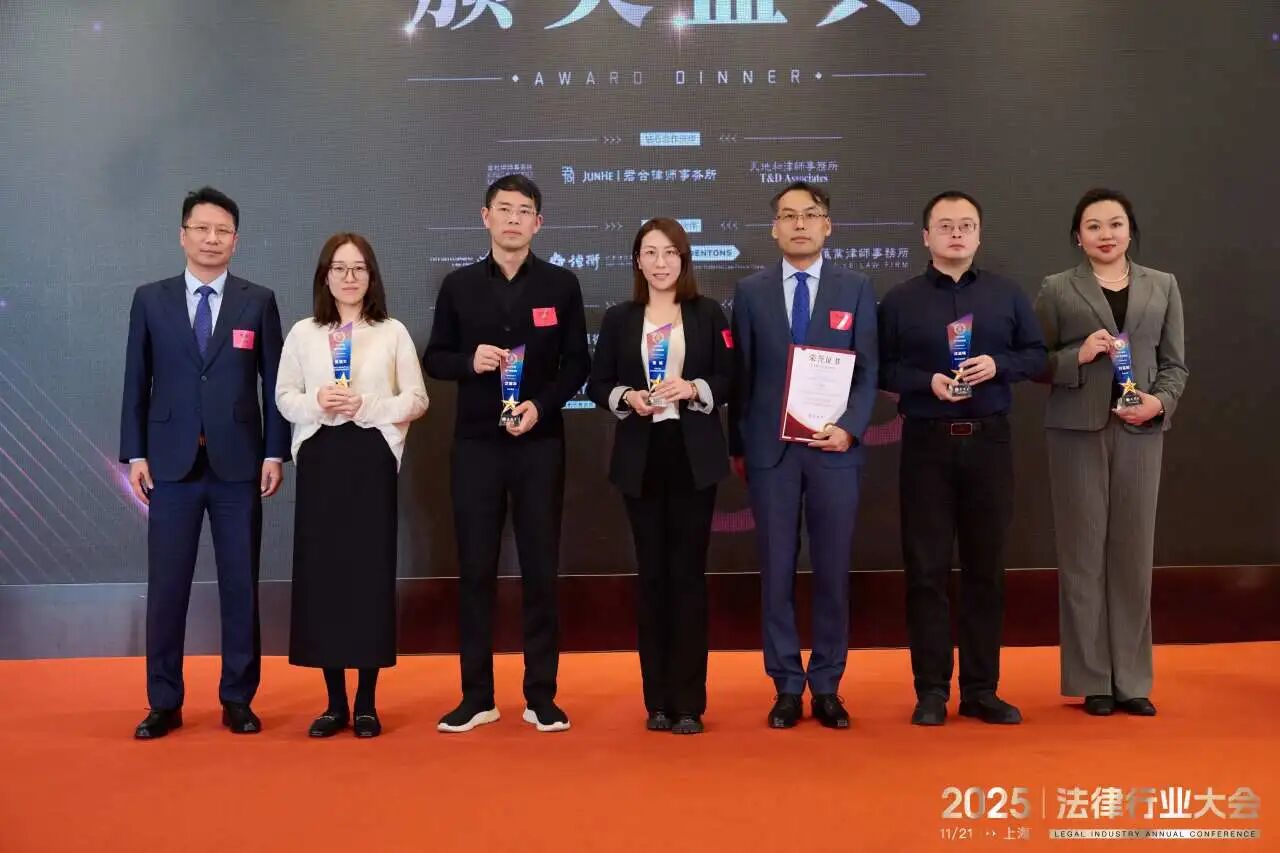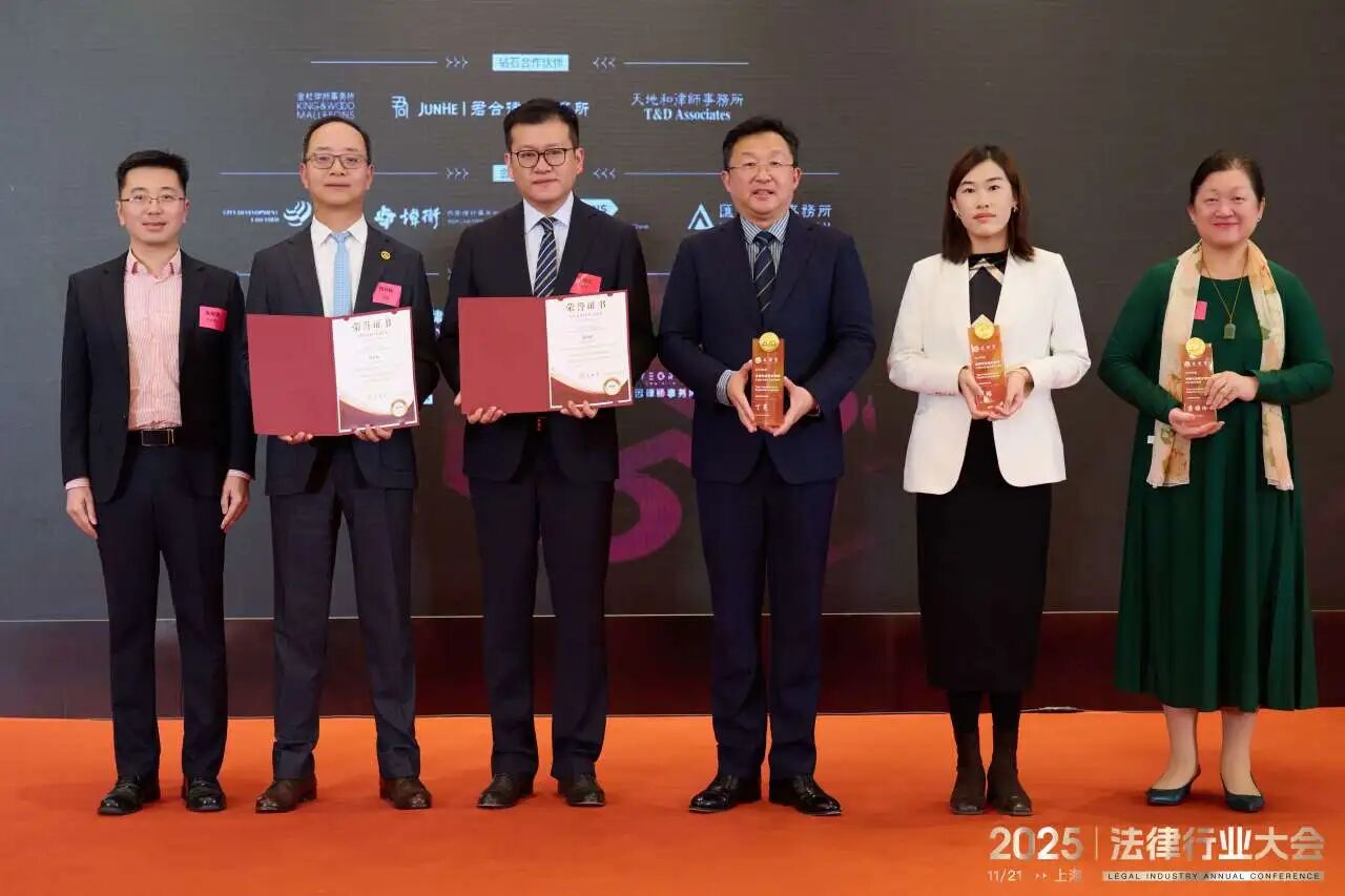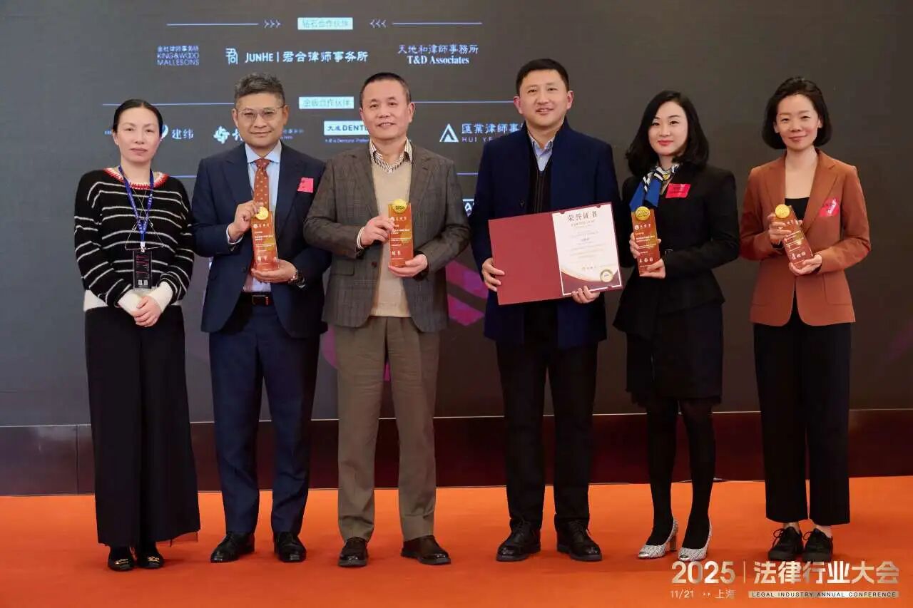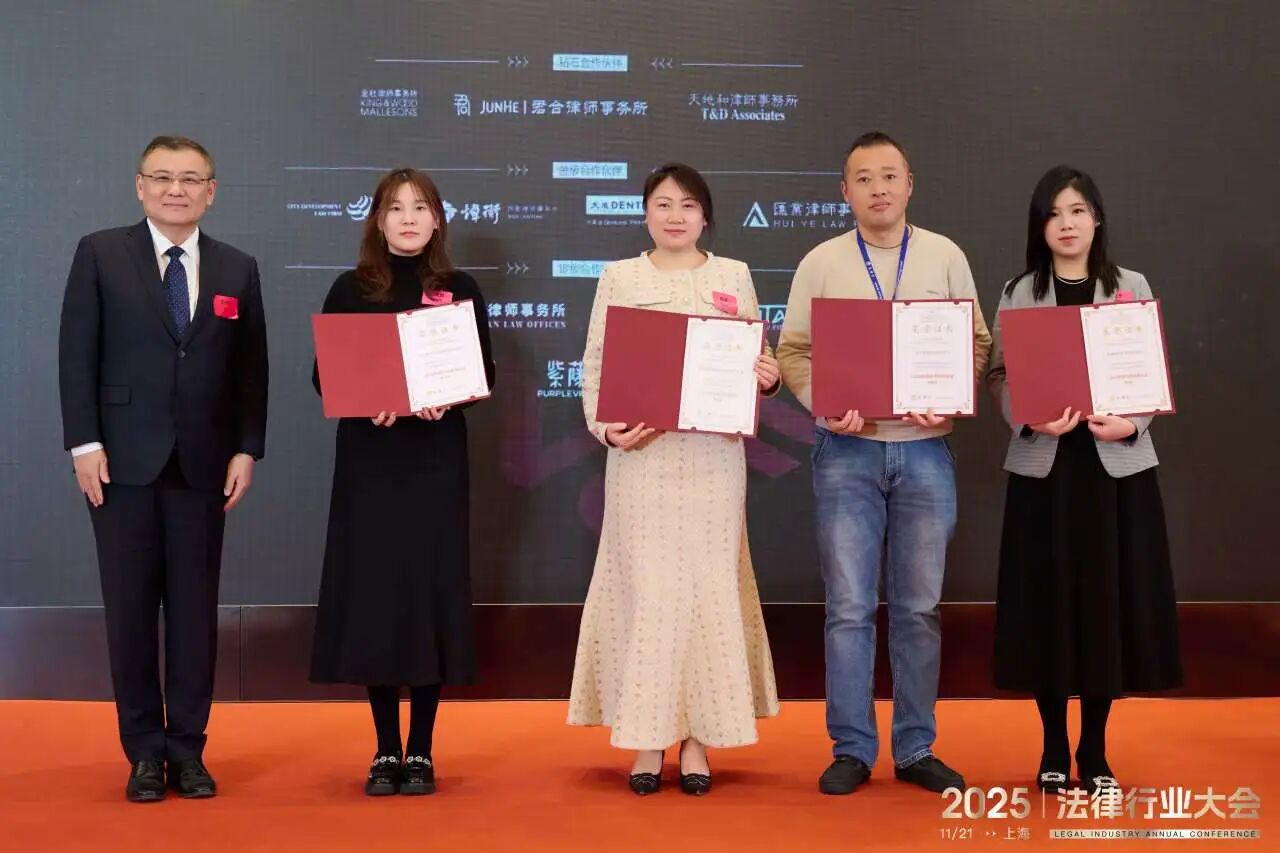 宁波均胜电子股份有限公司 总法律顾问王玉德(左一)为《2025名律堂法总推荐中国律师榜》的上榜律师颁发证书及奖杯;通力律师事务所合伙人李剑伟、安杰世泽律师事务所合伙人冯涛、金杜律师事务所合伙人李盛、海华永泰律师事务所主任陈峰、大成律师事务所合伙人陈峰依次登台领奖(顺序为从左至右)。