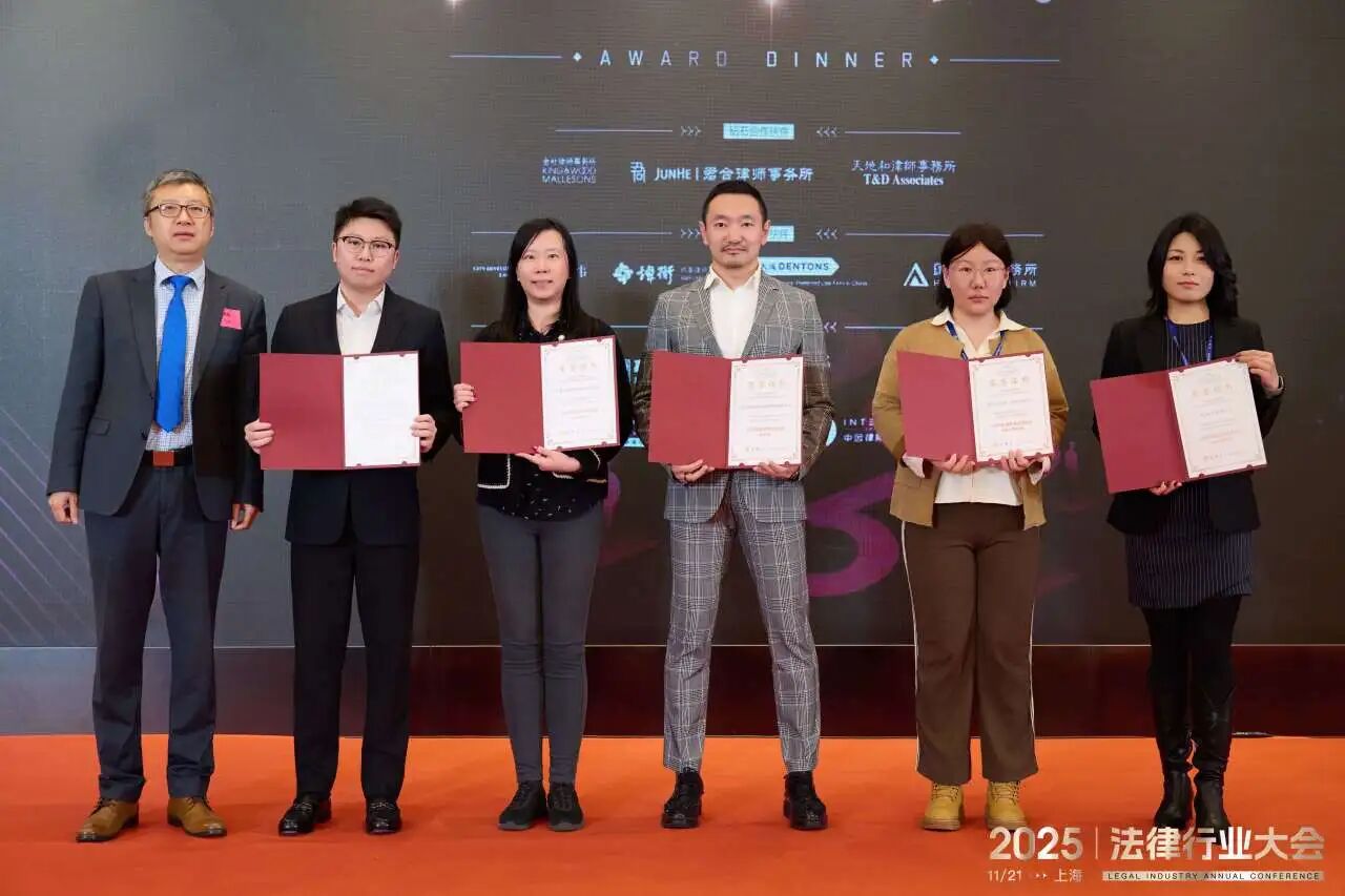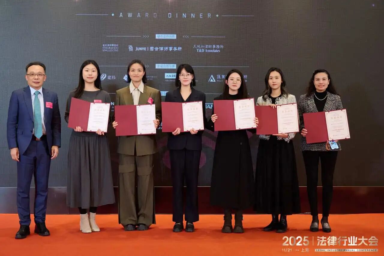 施耐德电气(中国)有限公司 大中华区总法律顾问夏淳婷(左一)为2025名律堂《中国法律先锋榜:争议解决大律师(诉讼)》的获奖律师颁发奖杯;汇业律师事务所管委会委员阚宇、炜衡律师事务所合伙人陈良、炜衡(上海)律师事务所高级合伙人吴俍君、金杜律师事务所管理团队合伙人王囝囝、植德律师事务所合伙人任珊珊依次登台领奖(顺序为从左至右)。