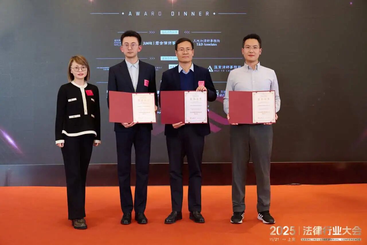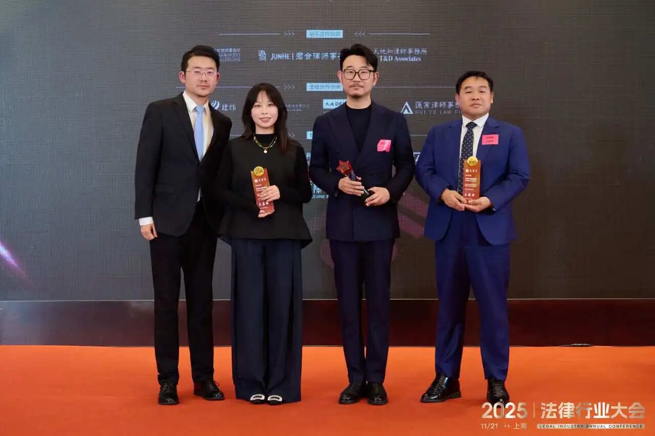 帝斯曼(中国)有限公司 副总裁/总法律顾问李春华(左一)为2025名律堂《中国法律先锋榜:卓越律所管理者》的获奖律师颁发奖杯;汇业律师事务所管委会委员吴冬、通力律师事务所管理合伙人韩炯、上海上正恒泰律师事务所主任周文平依次登台领奖(顺序为从左至右)。